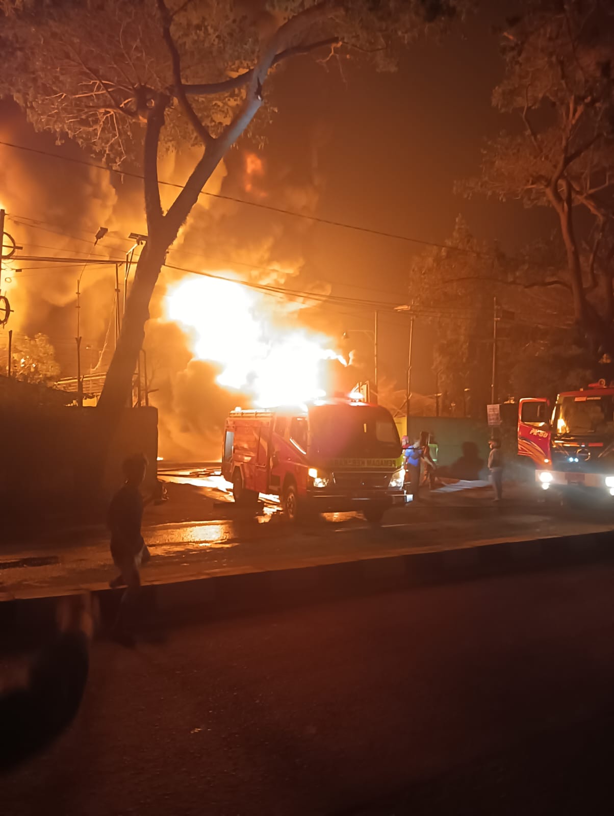Beberapa unit mobil pemadam kebakaran terlihat bersiaga di bagian belakang pabrik sandal tersebut. Sementara itu, aparat kepolisian juga tampak berjaga di sekitar area rel kereta api untuk mengamankan lokasi dan mengatur situasi.