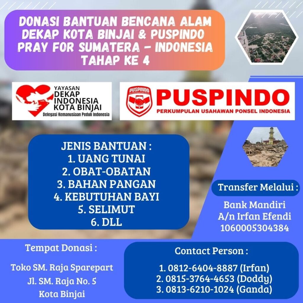 Menjawab panggilan kemanusiaan itu, Yayasan DEKAP Indonesia Kota Binjai bersama Delegasi Kemanusiaan Peduli Indonesia, bekerja sama dengan Ketua Sahrul Rahman, PUSPINDO (Perkumpulan Usahawan Ponsel Indonesia), kembali membuka Galang Donasi Bantuan Bencana Alam “Pray for Sumatera – Indonesia” Tahap Ke-4.